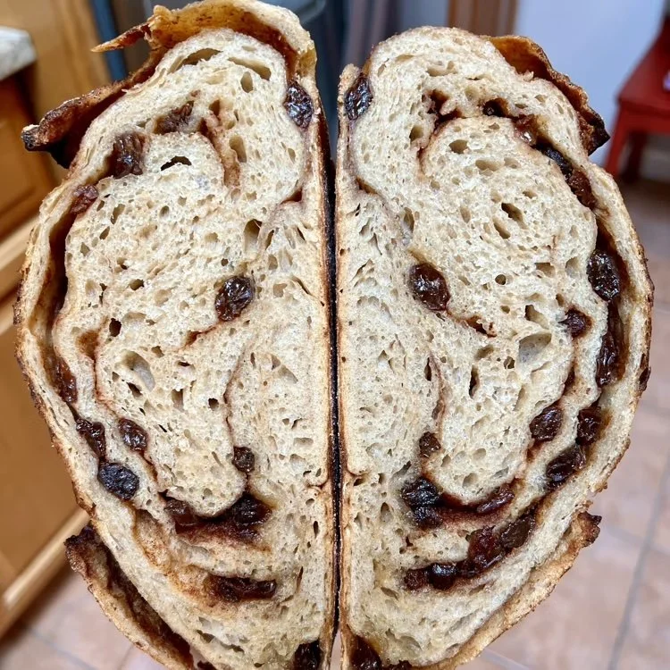 Ingredients: Organic All Purpose Flour, Organic Whole Wheat Flour, Water, Raisins, Butter, Brown Sugar, Cinnamon, Pink Himalayan Salt, Rice Flour (for dusting)