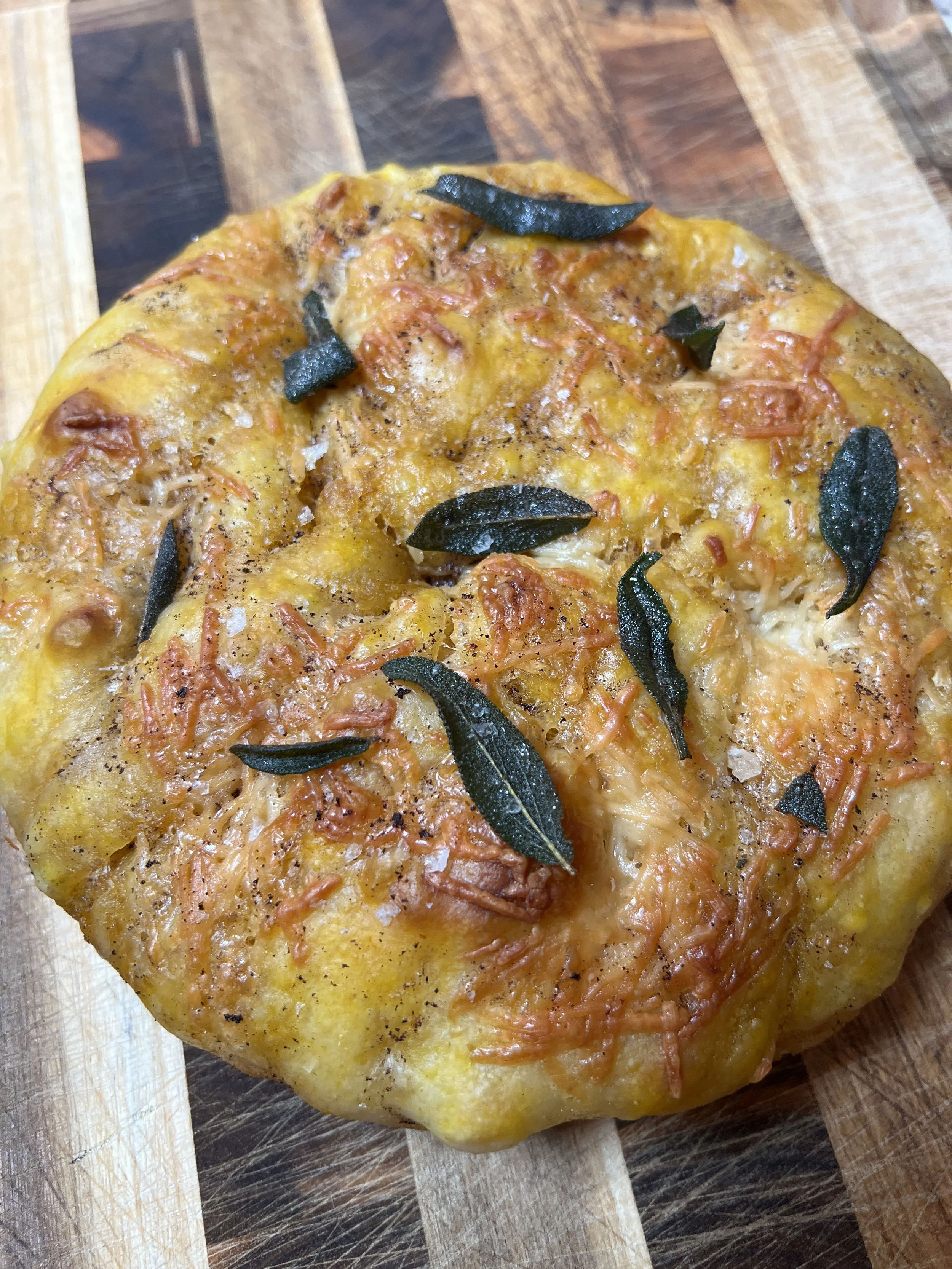 This sourdough focaccia is infused with pumpkin, nutmeg, a *tiny* bit of honey and then topped with a three cheese blend - Parmesan, Asiago, Fontina and baked until perfection. Once it comes out of the oven, it is topped with sage fried in brown butter.